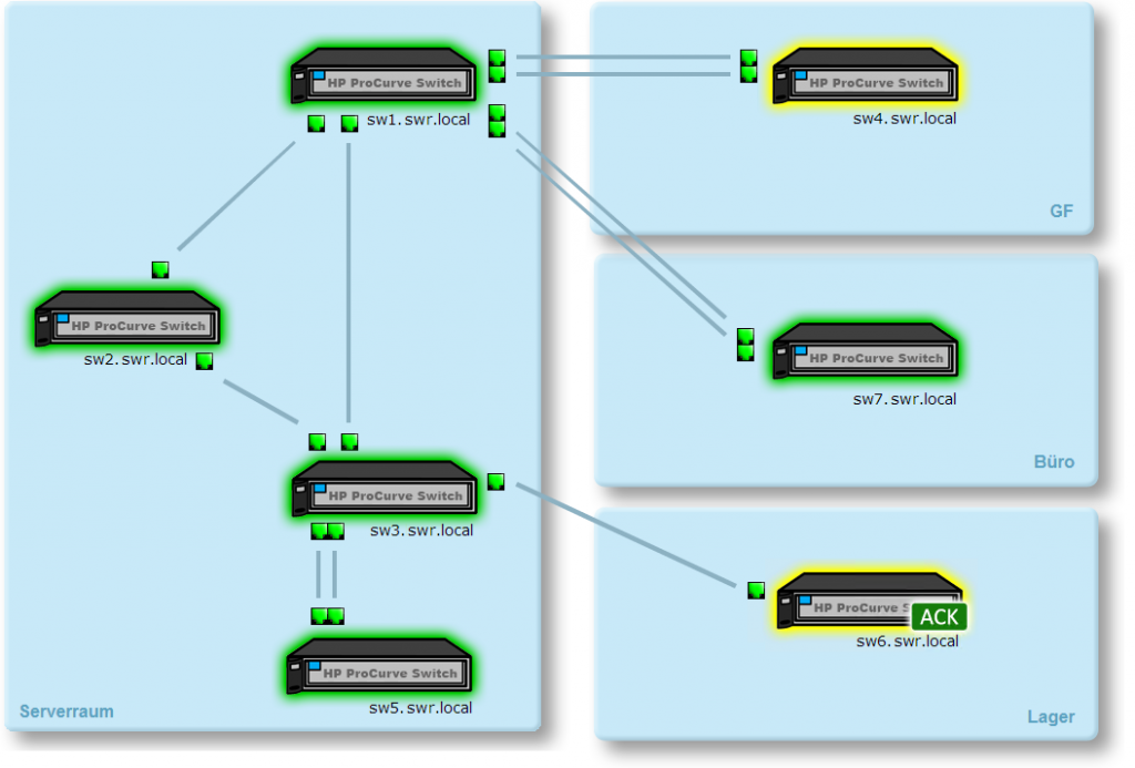 Durch die im Pro-NetS Server- und Netzwerkmonitoring enthaltene Erweiterung NagVis lassen sich verschiedenste grafische Darstellungen abbilden. Diese geben z.B. durch Farben oder Icons den aktuellen Status Ihrer Umgebung wieder.