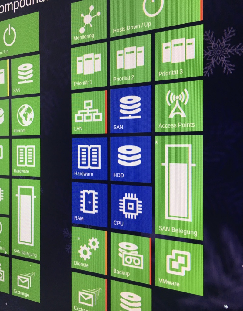 Durch die im Pro-NetS Server- und Netzwerkmonitoring enthaltene Erweiterung NagVis lassen sich verschiedenste grafische Darstellungen abbilden. Diese geben z.B. durch Farben oder Icons den aktuellen Status Ihrer Umgebung wieder.